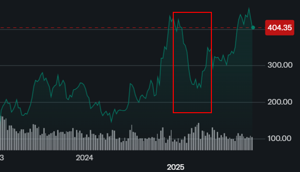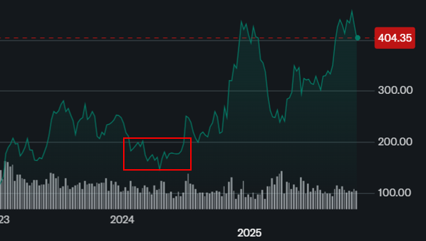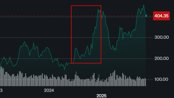 | 7~12월 | 200 → 400달러까지 급등 / 변동성 증가 | $0.8~1.2 |