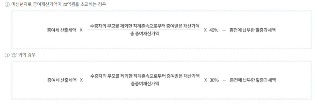 수증자가 증여자의 자녀가 아닌 직계비속인 경우에는 증여세를 할증하여 계산합니다