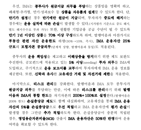 - 일부 비율: 벤처·중소기업 등 모험자본 (단계적으로 상향하되, 25%까지 상향)