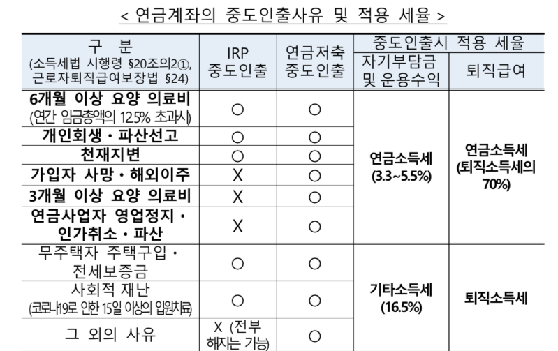 - (주택자금은 부득이한 사유로 인정되지 않아 인출 시 저율과세혜택은 받지 못함)